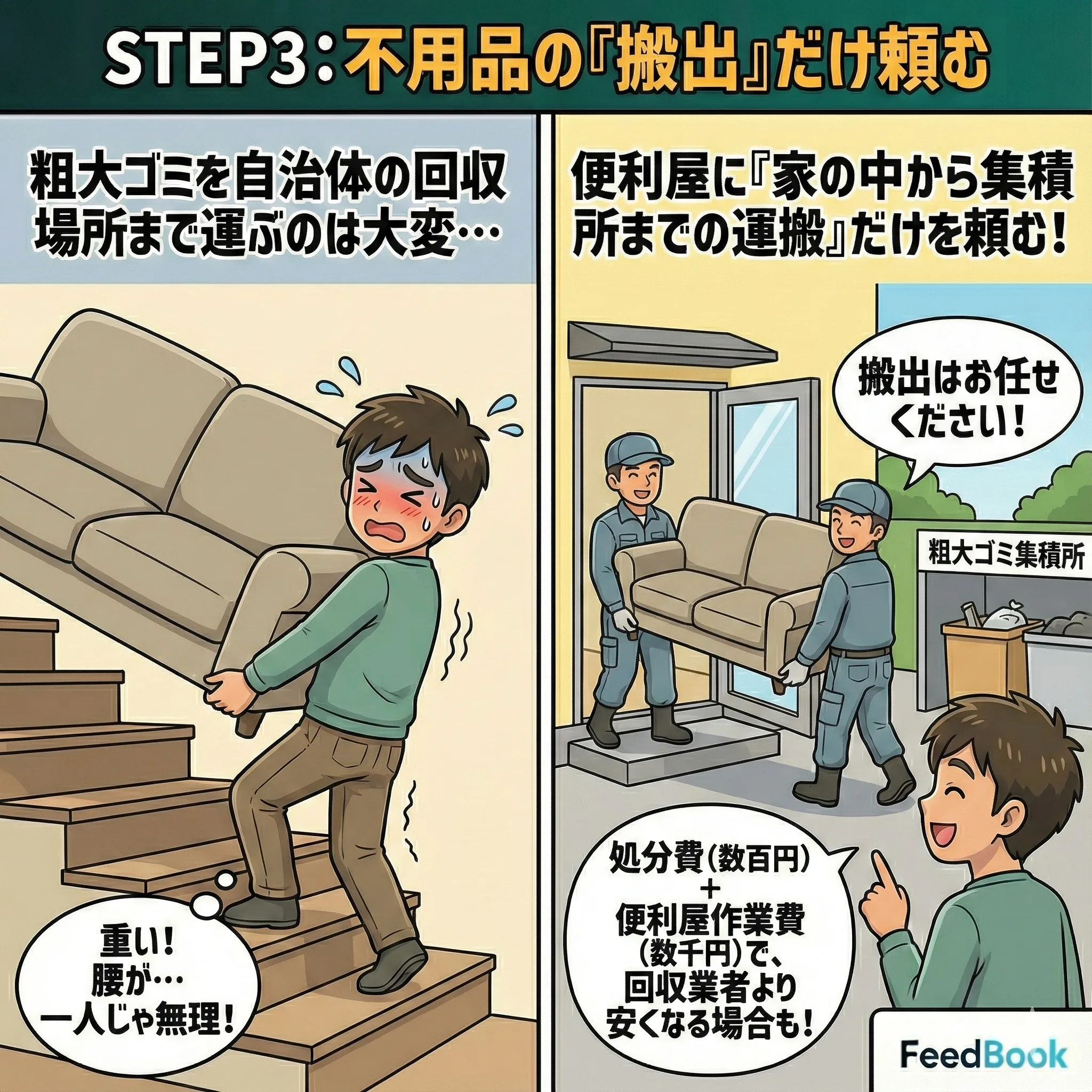 粗大ゴミを捨てる際、自治体の回収場所まで運ぶのが一番大変です。便利屋に「家の中から集積所までの運搬」だけを頼めば、処分費は自治体の数百円+便利屋の作業費(数千円)で済み、不用品回収業者より安くなる場合があります。
