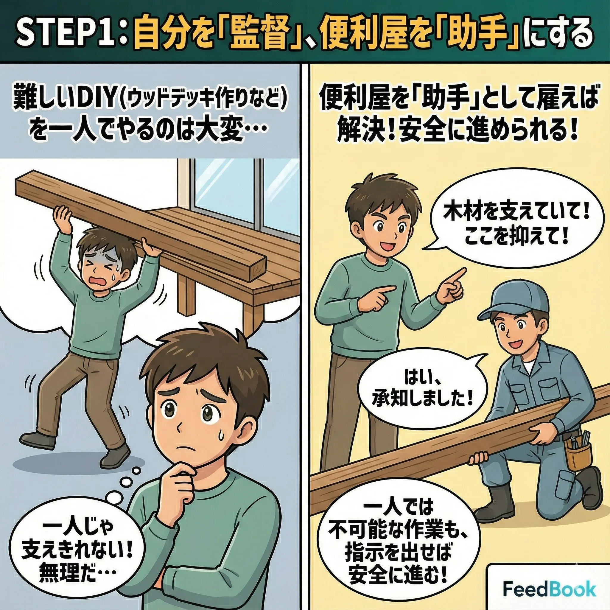難しいDIY(ウッドデッキ作りなど)を一人でやるのは大変ですが、便利屋を「助手」として雇えば解決します。「木材を支えていて」「ここを抑えて」と指示を出せば、一人では不可能な作業も安全に進められます。