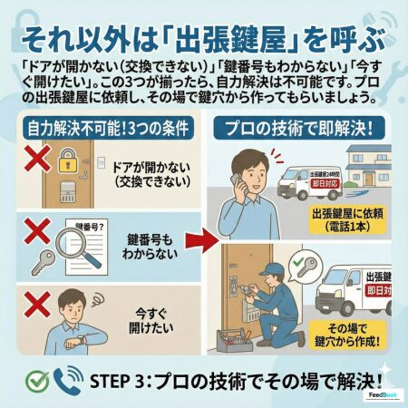 住宅開錠(一般キー): 6,600円〜特殊キー(ディンプル・カード等): 11,000円〜鍵交換: 6,600円〜(部品代別)出張費: 4,400円〜(地域により変動)分析リスク: 一部の紹介サイトでは「出張見積無料」とされていますが、公式サイトには「出張料金4,400円〜」の記載があります。