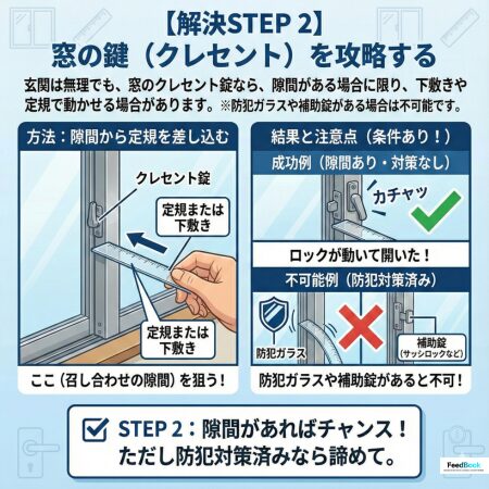 玄関は無理でも、窓の鍵(クレセント錠)なら、隙間がある場合に限り、下敷きや定規を差し込んでロックを動かせる場合があります。※防犯ガラスや補助錠がある場合は不可能です。