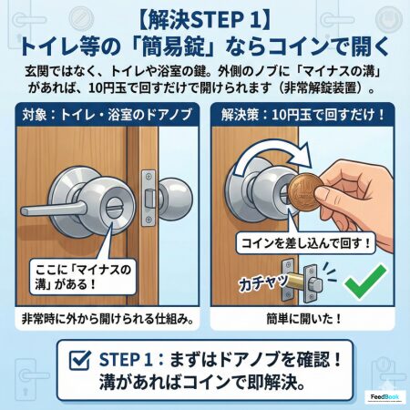玄関ではなく、トイレや浴室の鍵が開かない場合、外側のノブに「マイナスの溝」があれば、10円玉を差し込んで回すだけで開けられます(非常解錠装置)。