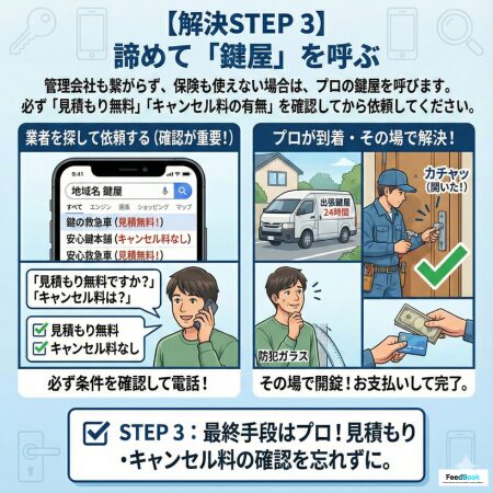管理会社も繋がらず、保険も使えない場合は、プロの鍵屋を呼びます。「地域名 鍵屋」で検索し、必ず「見積もり無料」「キャンセル料の有無」を確認してから依頼してください。