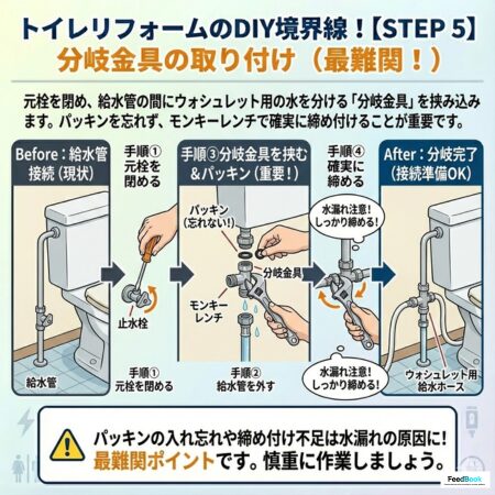 最難関ポイントです。 元栓を閉めてから、タンクへ繋がる給水管を外し、ウォシュレット用の水を分ける「分岐金具」を間に挟み込みます。パッキンを忘れずに入れ、モンキーレンチで確実に締めます。