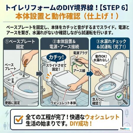 便器にベースプレートを固定し、本体を「カチッ」と音がするまでスライドさせます。電源とアースを繋ぎ、水漏れがないか確認しながら試運転を行います。