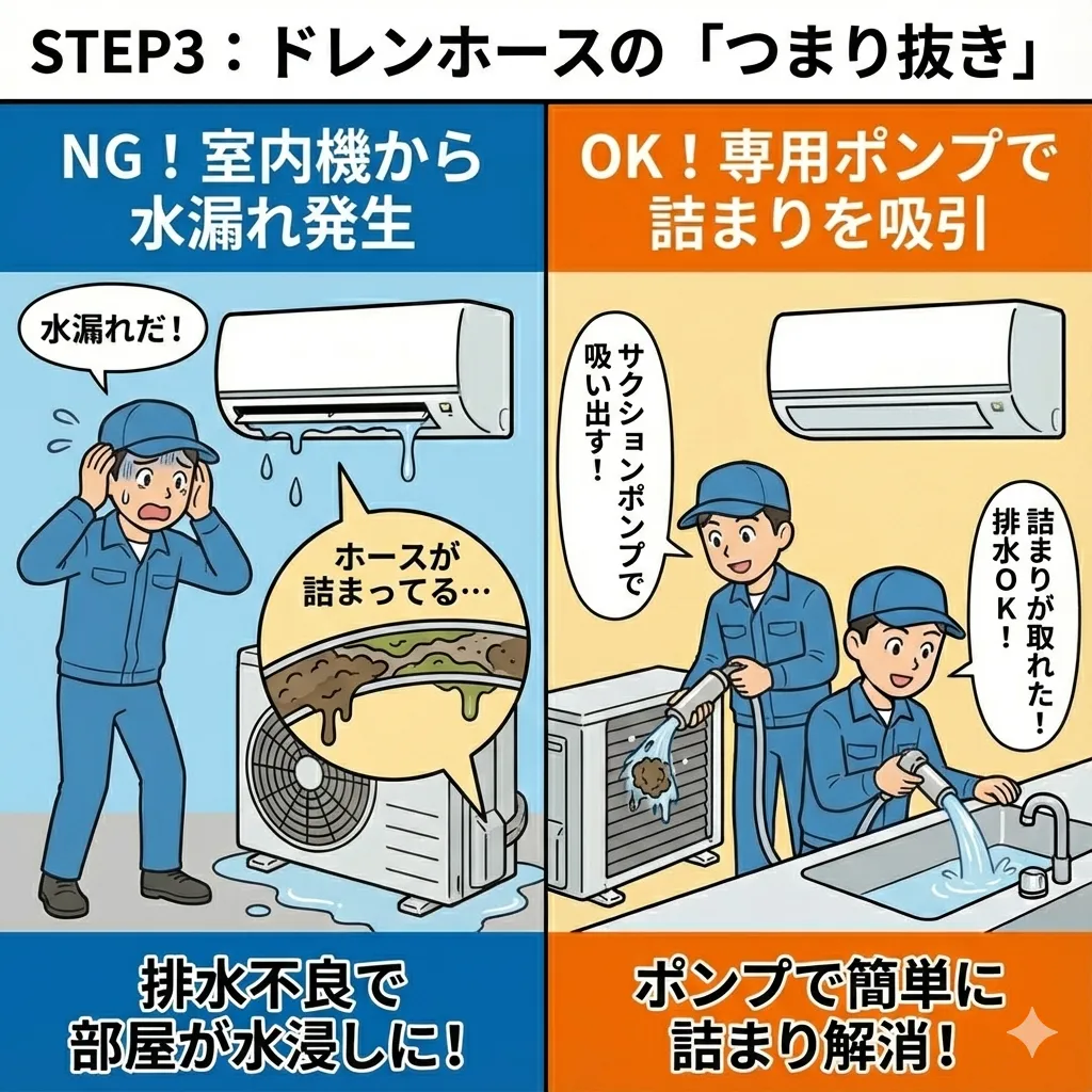室内機から水漏れする場合、外のドレンホース(排水管)が泥や虫で詰まっています。「ドレン用サクションポンプ」で吸い出すと、詰まりが取れて水漏れが止まります。