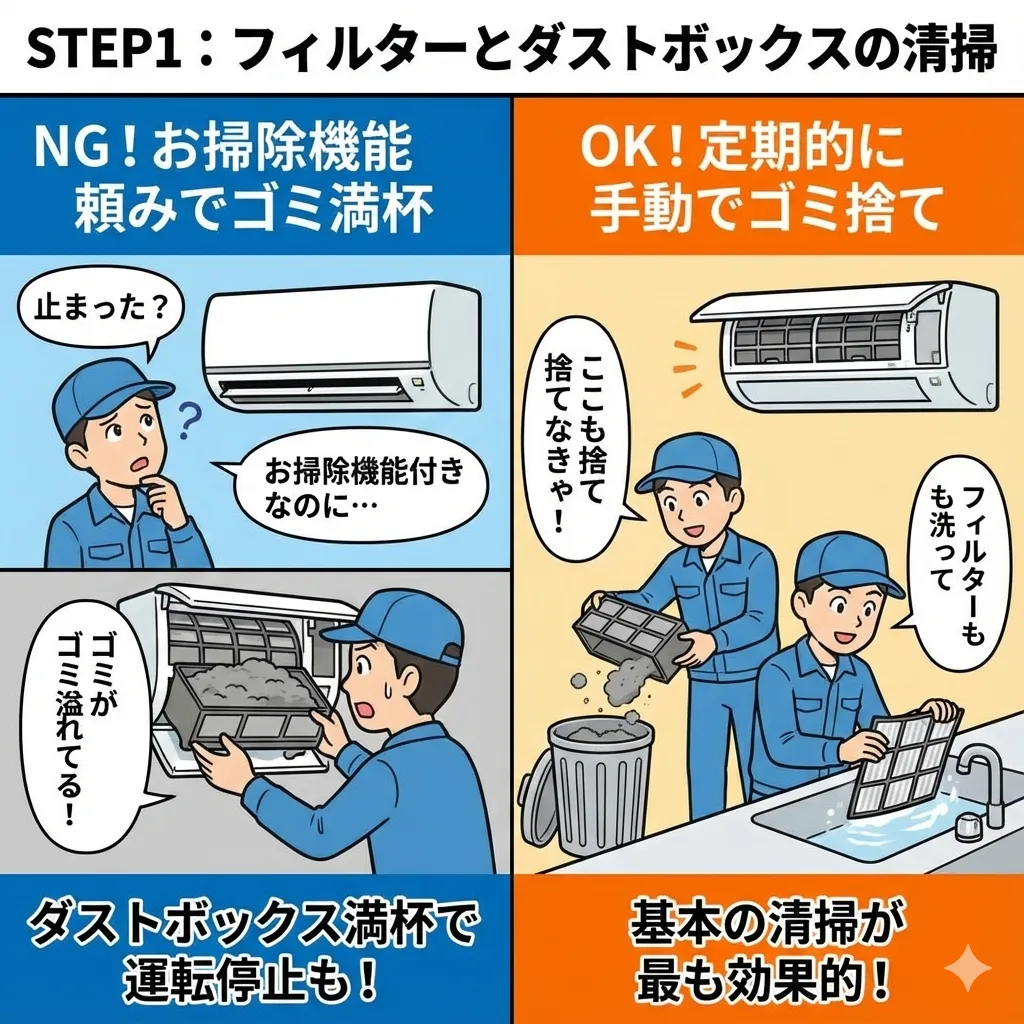 基本中の基本ですが、最も効果があります。お掃除機能付きエアコンでも、ダストボックス(ゴミ箱)のゴミは自分で捨てる必要があります。ここが満杯だと運転が止まる機種もあります。