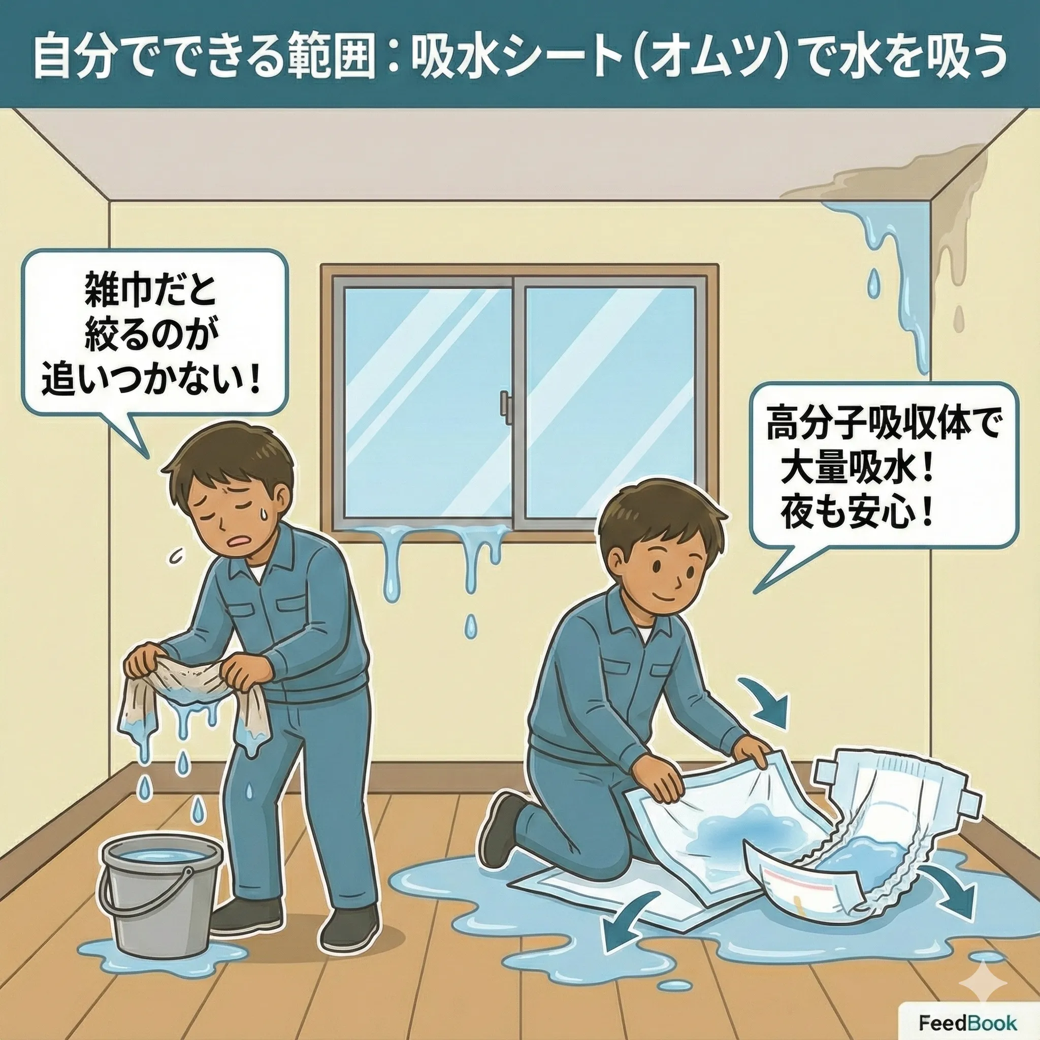 サッシ枠や天井の隅からじわじわ水が出る場合、雑巾では絞るのが追いつきません。ペットシーツや紙オムツなどの「高分子吸収体」を使うと、大量の水を吸い取ってくれるため、夜も安心して眠れます。