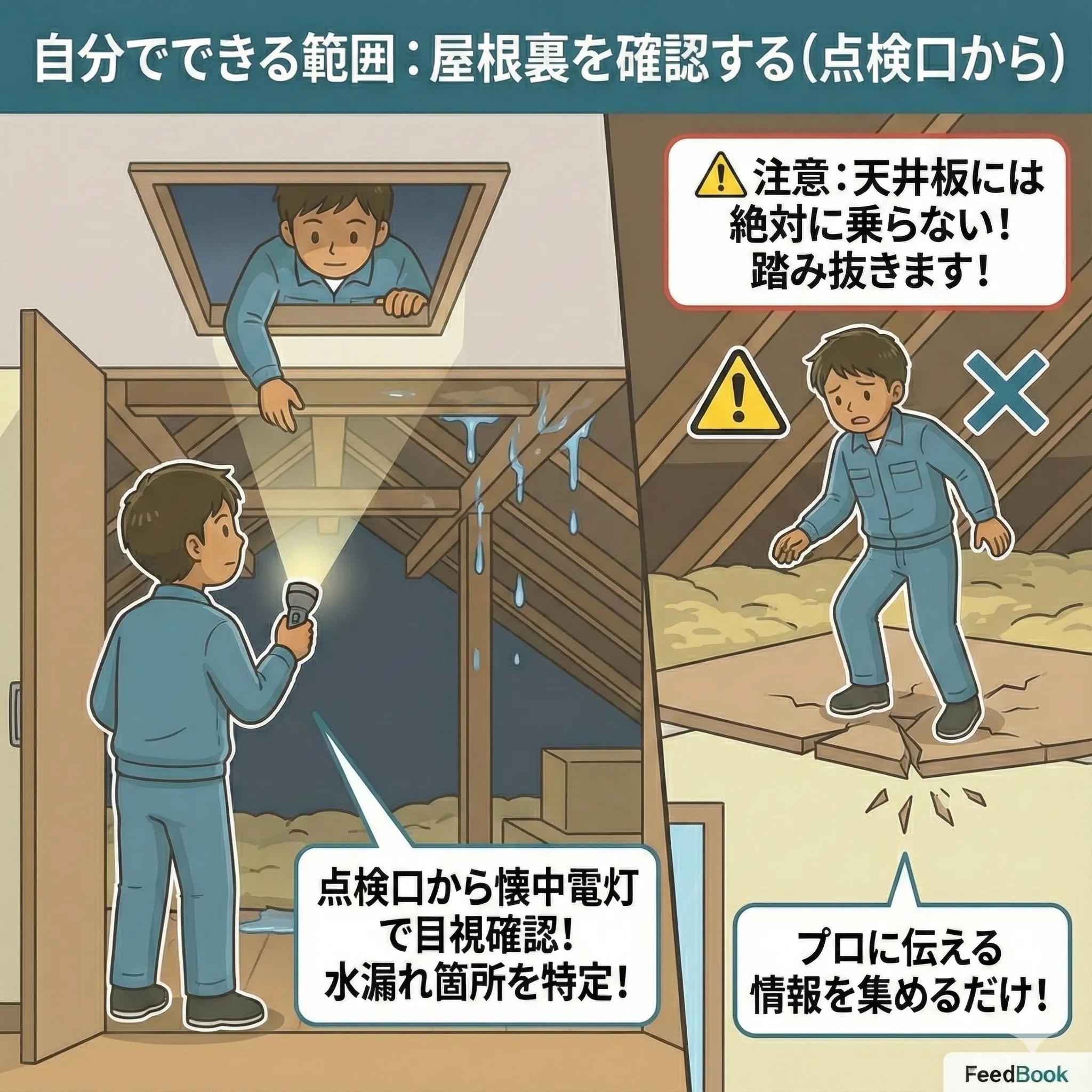 雨の日や風の強い日に屋根に登るのは、プロでも命がけの行為です。また、知識のないままシーリング材(コーキング)で隙間を埋めると、水の逃げ場を失くし、かえって木材を腐らせる原因になります。 本記事では、室内でできる安全な水受けの方法と、プロに依頼するまでの間に被害を広げないための正しい知識を解説します。