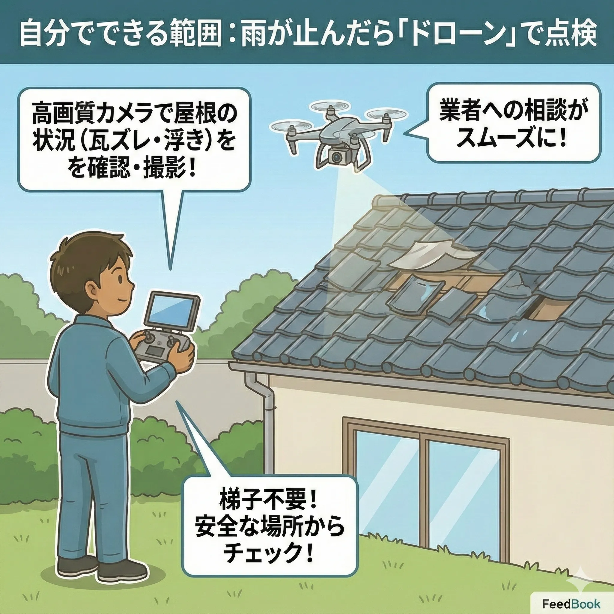 最近はホビー用ドローンでも高画質です。梯子で登らなくても、ドローンを飛ばして屋根の状況(瓦のズレや板金の浮き)を確認・撮影できれば、業者への相談がスムーズになります。