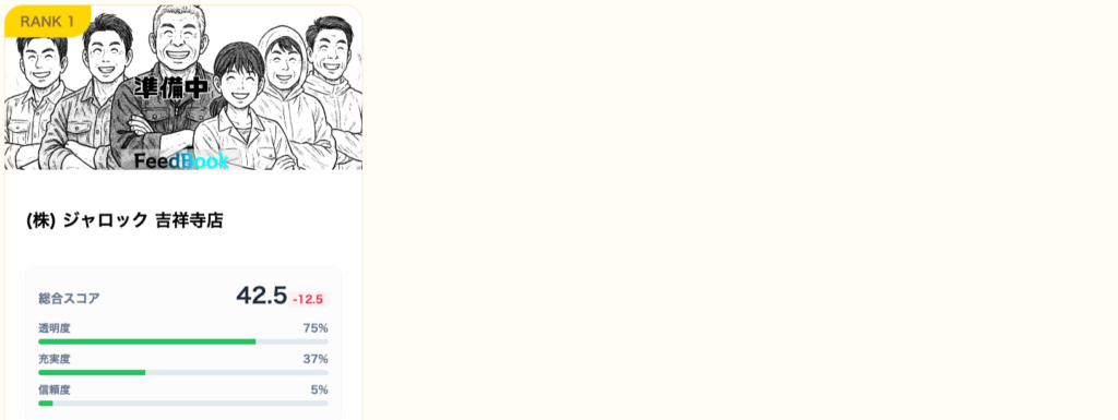 総合スコアは42.5点ですが、特筆すべきは「透明度75%」です。多くのネット業者が住所を隠す(またはレンタルオフィス等にする)中、吉祥寺エリアで実店舗を構え、情報を公開している点は最大の評価ポイントです。充実度(Web情報)は37%と発展途上ですが、困った時に「逃げ隠れしない拠点がある」という事実は、何よりの信頼の証です。