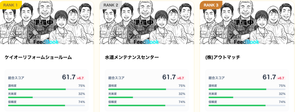 公平な格付けメディア「FeedBook」では、広告費を一切受け取らず、24時間体制で事業者の実態(運営の透明度・Web情報の充実度・信頼度)を調査しています。