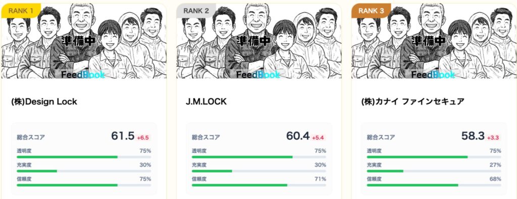 1位と僅差のスコアです。こちらもWebサイトの作り込みよりも、現場での技術力を優先している傾向が見て取れます。信頼度71%という数字は、一見客を騙して稼ぐスタイルでは決して出せないスコアです。困ったときに頼れる「街の鍵屋さん」として評価できます。