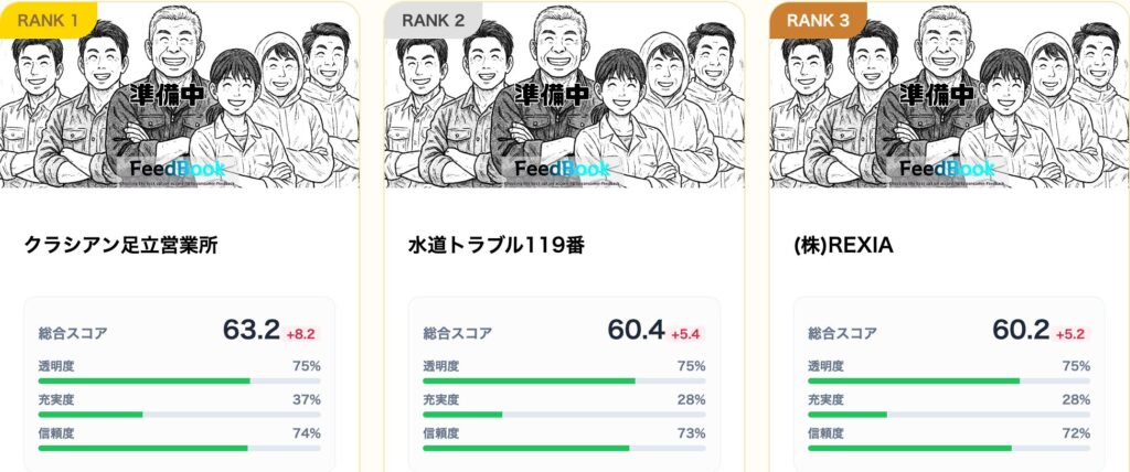 全国的な知名度を持つ企業ですが、足立区内にしっかりと拠点を構え、地域に根ざした営業を行っている点がデータに表れています。透明度・信頼度ともに高水準で、水道局指定工事店として法令順守の姿勢が明確です。Web上の情報は整理されていますが、過剰な「激安」アピールはなく、品質と対応力で勝負する正統派の優良店です。