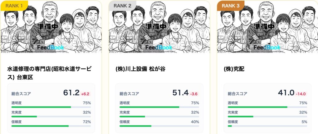 BEST3の店舗はいずれも、Web情報の充実度が30〜40%台と低めです。これはネガティブな要素ではありません。むしろ、Webサイトを過剰に作り込んで「キャンペーン」や「激安」をアピールする業者が多い中で、「見栄えよりも地道な営業を続けている業者」が上位に来ていることは、健全な競争が行われている証拠でもあります。