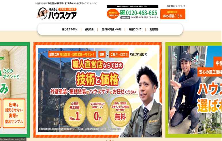 株式会社ハウスケアは、山形県東根市を拠点に、外壁・屋根塗装を中心とした施工実績No.1のリフォーム専門企業です。創業以来、代表・深瀬匠が窓口と現場管理を一人で担い、丁寧な対応と高品質な仕上がりを提供。地域全域を対応エリアとし、塗料プラン(シリコン・フッ素など)による耐久性重視の施工で、10年〜20年にわたる安心をお届けします。無料見積り・無理な営業なしで安心してご依頼いただけます。