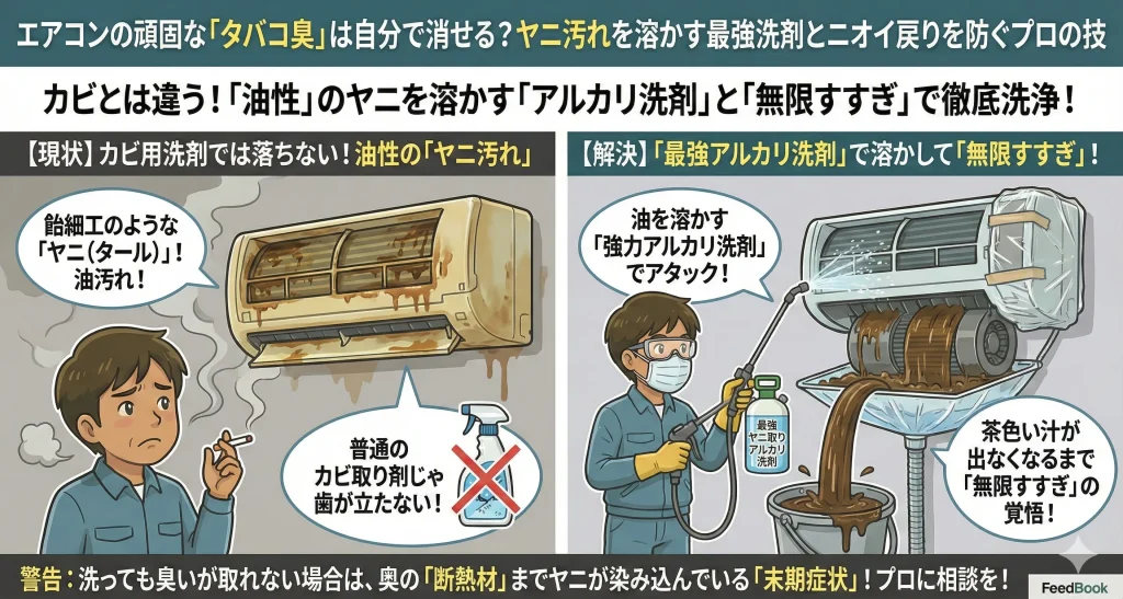 エアコンの頑固な「タバコ臭」は自分で消せる?ヤニ汚れを溶かす最強洗剤とニオイ戻りを防ぐプロの技