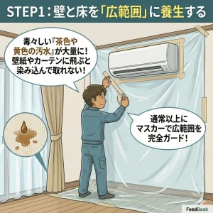 ヤニ汚れを洗浄すると、毒々しい「茶色や黄色の汚水」が大量に出ます。これが壁紙やカーテンに飛ぶと、染み込んで二度と取れません。通常の掃除以上に、マスカー(養生シート)で広範囲をガードしてください。