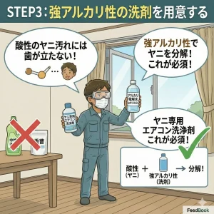 ヤニは酸性の汚れです。中性洗剤や重曹では歯が立ちません。「アルカリ電解水(pH12以上)」や、ヤニ汚れ専用のエアコン洗浄剤が必要です。