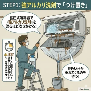 | 洗浄力 | 表面のヤニは落とせても、フィンの奥深くまで入り込んだタールまでは溶かしきれないことが多い。 | 専用の高圧洗浄機と、適切な濃度に調整した業務用の強アルカリ洗剤で、奥の奥まで貫通洗浄する。 |