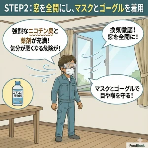 洗剤をかけると、強烈なニコチン臭と共に揮発した薬剤が充満します。閉め切った部屋で作業すると気分が悪くなる危険があるため、換気を徹底し、目や喉を守ってください。