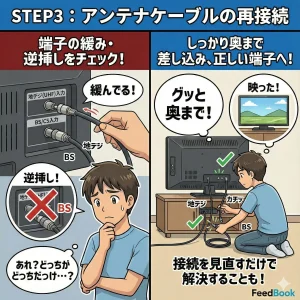 テレビやレコーダーの裏側の端子が緩んでいないか確認します。また、地デジ(UHF)とBSの端子を逆に挿していないかもチェックしてください。