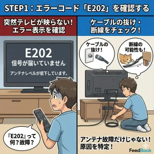 テレビが映らない時、画面に出るエラーコードを確認します。「E202(信号が届いていない)」の場合、アンテナの故障だけでなく、ケーブルの抜けや断線の可能性があります。