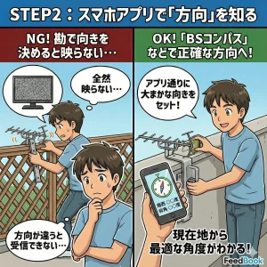 「BSコンパス」などの無料アプリを使うと、現在地からアンテナを向けるべき方位と仰角(上下の角度)がわかります。まずはアプリに従って大まかな向きを決めます。