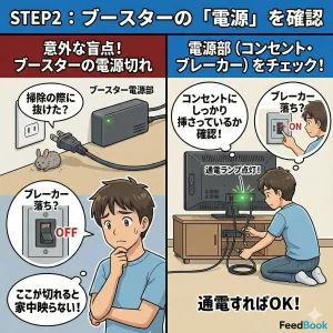 意外と多いのが「ブースター(増幅器)の電源切れ」です。ブースターの電源部はコンセントに挿さっていますが、掃除の際に抜けていたり、ブレーカーが落ちていることがあります。ここが通電していないと、家中のテレビが映りません。