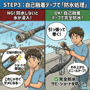 ケーブルの接続部分(コネクタ)に水が入ると、芯線が錆びてショートします。必ず、引っ張るとゴム化する「自己融着テープ」を巻き、その上からビニールテープを巻いて完全防水します。
