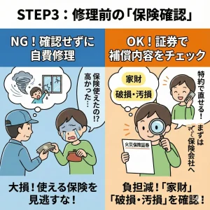 意外と知られていませんが、台風だけでなく「子供が割った」「模様替えでぶつけた」という事故も、火災保険の「家財」や「破損・汚損」特約で補償される場合があります(免責金額に注意)。ガラス屋を呼ぶ前に、必ず保険会社に確認してください。