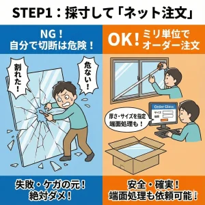 自分でガラスを切るのは危険すぎます。「オーダーガラス板」の通販サイトで、厚み(3mmや5mm)とサイズをミリ単位で指定し、切断されたものを買ってください。端面処理(怪我防止加工)も頼めます。