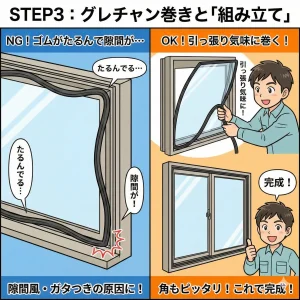 新しいガラスに「グレイジングチャンネル(グレチャン)」というゴムを一周巻きつけます。これをサッシの枠にはめ込み、ビスを締め直せば完成です。ゴムがたるまないように引っ張り気味に巻くのがコツです。