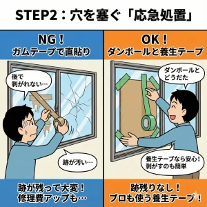 業者が来るまで、または新しいガラスが届くまでの応急処置です。穴が開いた部分をダンボールで挟み、養生テープで固定します。ガムテープだと跡が残るため、必ず「養生テープ」を使ってください。