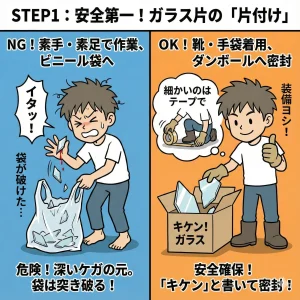 まずスリッパか靴を履いてください。微細な破片を踏むと深く刺さります。大きな破片は手袋をして拾い、細かい破片は掃除機で吸った後、ガムテープでペタペタと除去します。破片はダンボール箱に入れて密封し、「キケン!ガラス」と大きく書いてください。