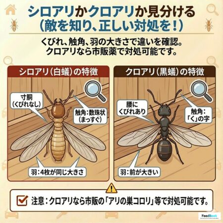 - 本記事では、羽蟻を見つけた時の正しい「応急処置」と、シロアリかクロアリかの見分け方、そしてプロに頼むべき判断基準を解説します。大切な家を守るために、今すぐ確認してください。