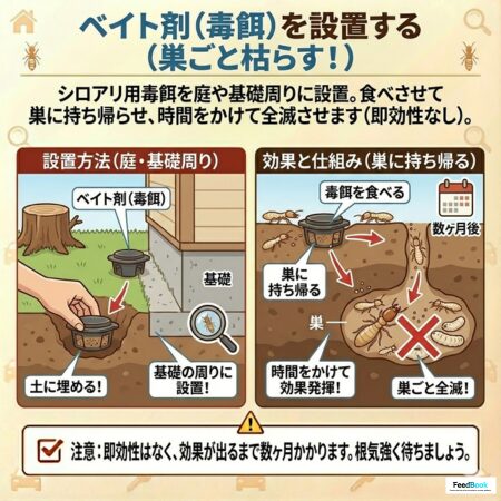 シロアリと判明した場合、スプレーではなく「食べさせて巣ごと枯らす」ベイト剤を使用します。シロアリがいそうな庭の土や、基礎の周りに設置します。