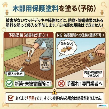 まだ被害がない場所(ウッドデッキや縁側など)には、防腐・防蟻効果のある塗料を塗って予防します。すでに食べられている場所に塗っても内部の駆除はできません。