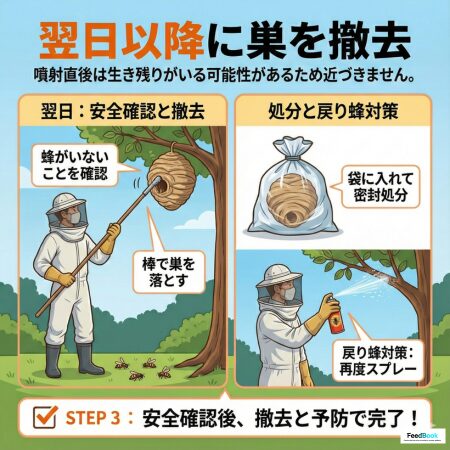 噴射直後は生き残りがいる可能性があるため近づきません。翌日、蜂がいないことを確認してから棒などで巣を落とし、袋に入れて処分します。戻り蜂対策として、巣があった場所に再度スプレーをしておきます。
