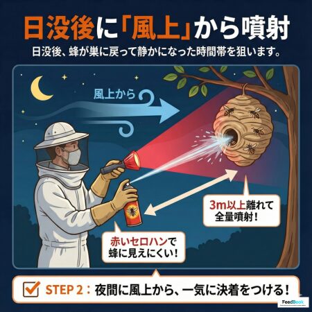 日没後、蜂が巣に戻って静かになった時間帯を狙います。懐中電灯には赤いセロハンを貼り(蜂は赤い光を認識しにくい)、風上から3m以上離れて巣の出入り口に向け、殺虫剤を全量噴射しきります。