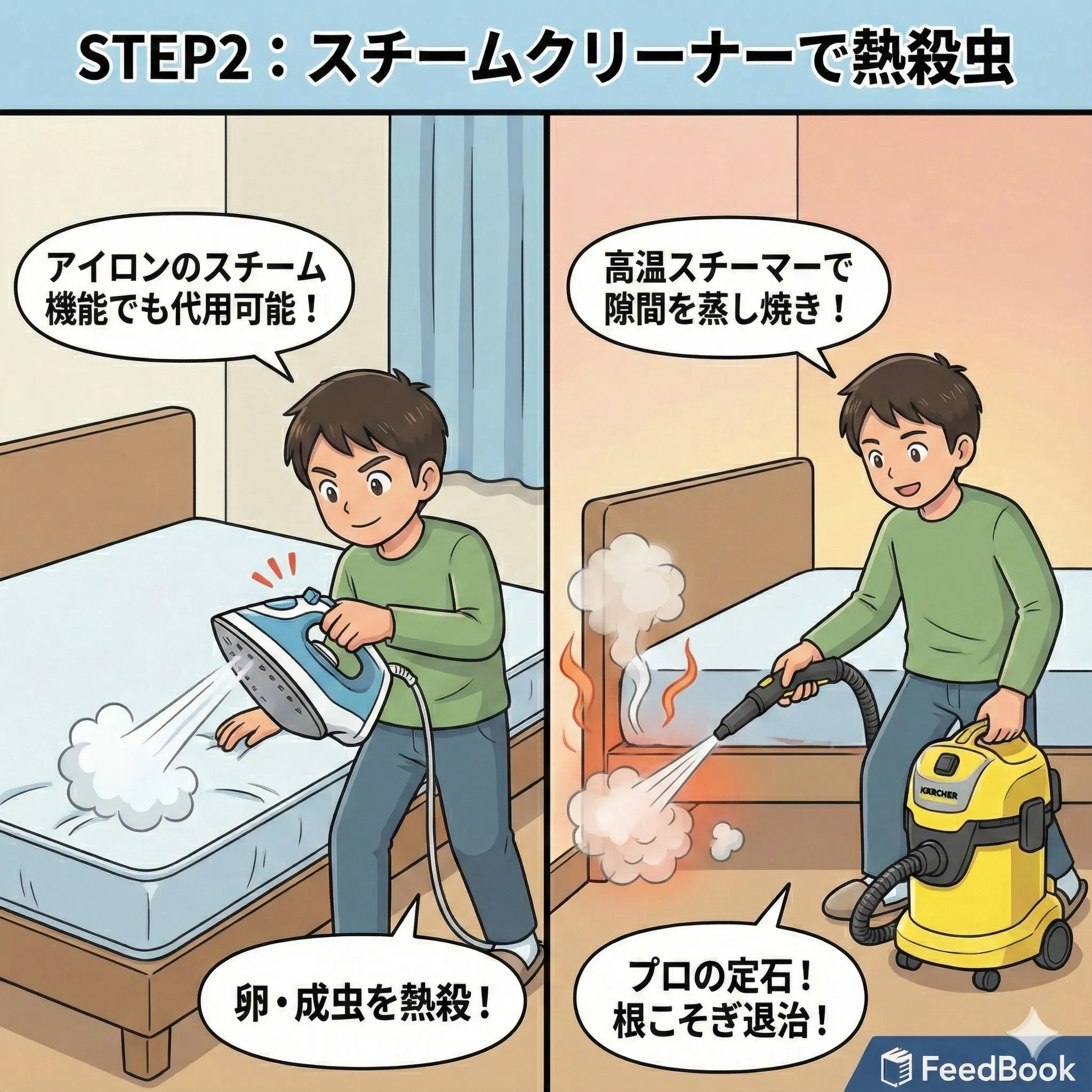 卵や潜んでいる成虫を殺すには、高温スチームが最も有効です。アイロンのスチーム機能でも代用可能ですが、ケルヒャーなどの高温スチーマーで隙間を蒸し焼きにするのがプロの定石です。