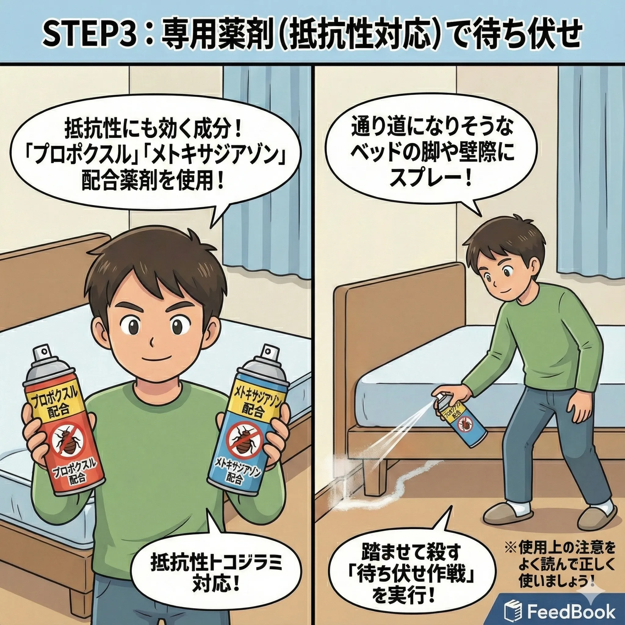 「プロポクスル」や「メトキサジアゾン」など、抵抗性トコジラミに効く成分が入った薬剤を使用します。通り道になりそうなベッドの脚や壁際にスプレーし、踏ませて殺す「待ち伏せ作戦」を行います。