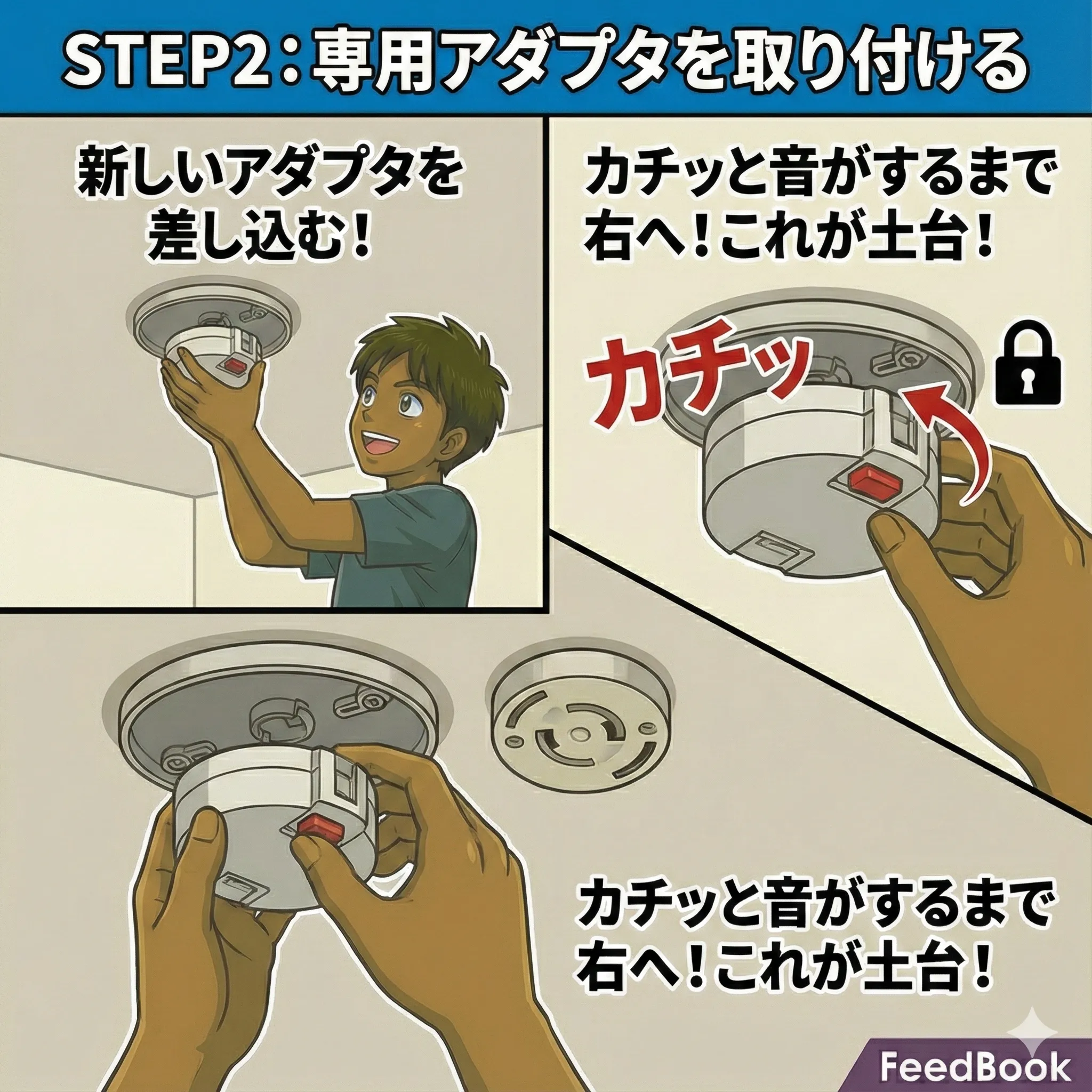 新しい照明に付属している「専用アダプタ」を、天井の引掛シーリングに差し込み、「カチッ」と音がするまで右に回します。これが照明の土台になります。
