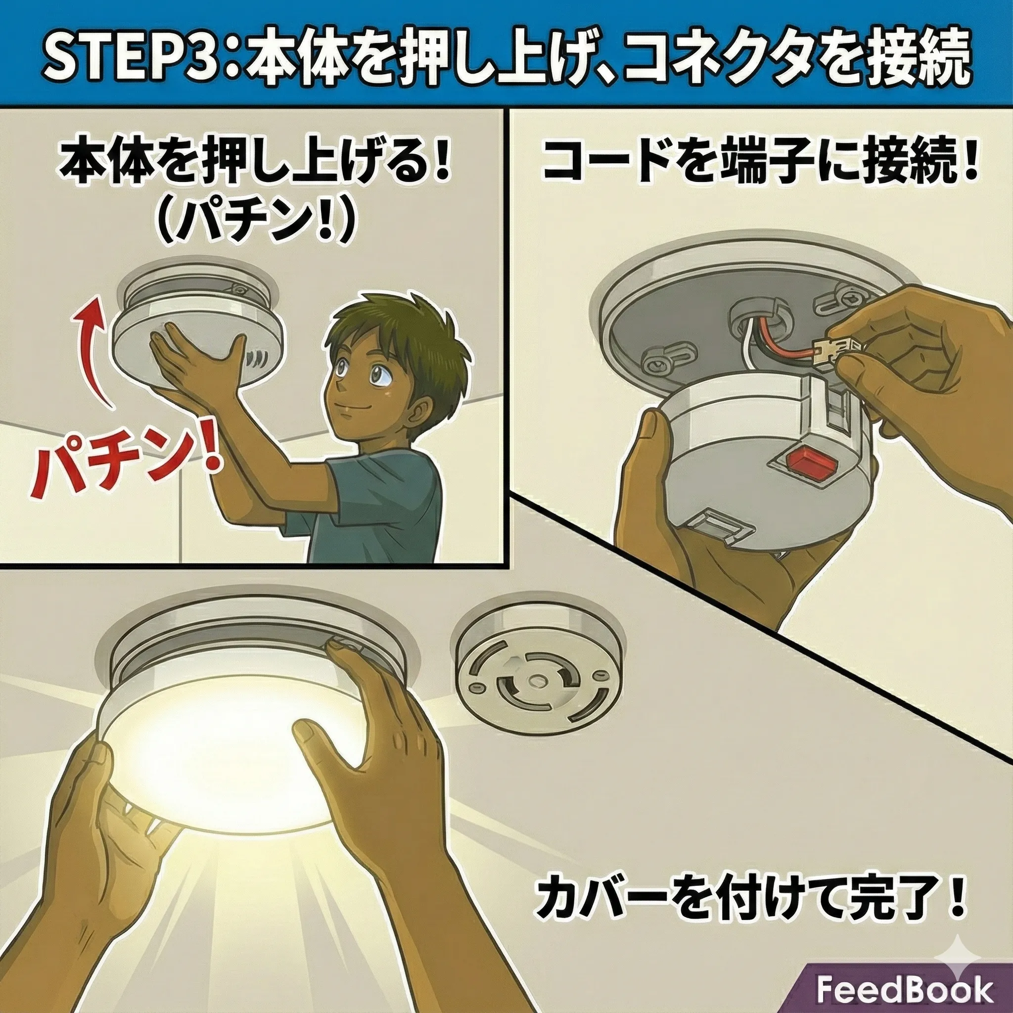 照明本体をアダプタの中心に合わせて押し上げます(パチンとロックされます)。その後、アダプタから出ているコードを本体の端子に確実に差し込みます。カバーを付ければ完了です。