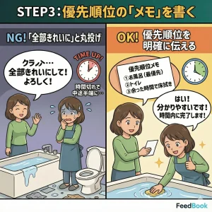 時間は有限です。「1. お風呂掃除、2. トイレ、3. 余った時間で床拭き」のように、優先順位を明確に伝えます。「全部きれいにして」という丸投げは、時間切れによる中途半端な仕上がりを招きます。