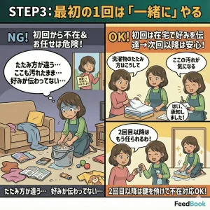 初回は必ず在宅し、「ここの汚れが気になる」「洗濯物のたたみ方はこうして」と好みを伝えます。2回目以降は鍵を預けて不在対応(DIY不要の完全お任せ)に移行できます。