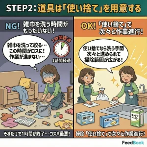 雑巾を洗って絞る時間はロスです。使い捨ての「お掃除シート」や「メラミンスポンジ」、「キッチンペーパー」を多めに用意しておくと、スタッフは次々と作業を進められ、掃除範囲が広がります。