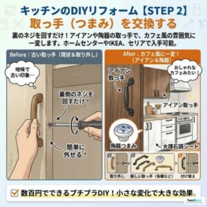 扉の取っ手は、裏側のネジを回すだけで簡単に外せます。ホームセンターやIKEA、セリアなどで売っている「アイアン」や「陶器」の取っ手に付け替えるだけで、カフェ風の雰囲気に一変します。