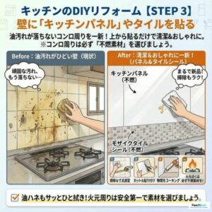 コンロ周りの油汚れが落ちない場合、上から貼れる「キッチンパネル」や「耐熱タイルシール」で隠してしまうのも手です。ただし、コンロ周りは必ず「不燃素材」を選ぶ必要があります。