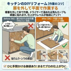 蝶番(ちょうつがい)のネジを外して扉を取り外し、床などの平らな場所で作業します。ドライヤーで温めながらシートを伸ばして貼ると、角やカーブも綺麗に仕上がります。