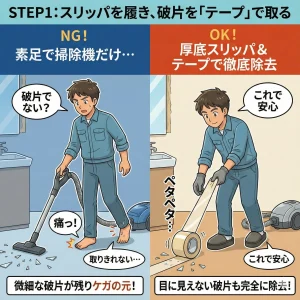 鏡の破片は薄く鋭利で、部屋の隅まで飛散します。まずは底の厚いスリッパを履いてください。大きな破片を拾った後、粉々になった破片は掃除機で吸い、さらにガムテープでペタペタして完全に取り除きます。